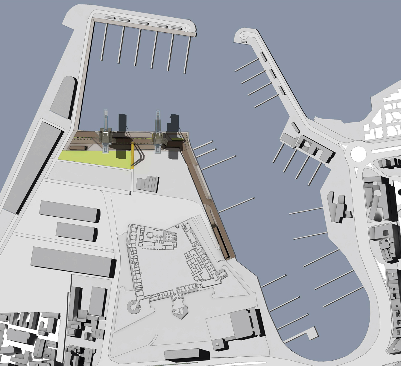 To renew the site’s identity, the entire area, a strip between the city and the sea, is transformed into a filtering element that connects instead of dividing these two environments and that manages the encountering between their processes: the South crane will be converted into a contemporary art museum, O.P.A. - Observatory of Palermo for the Arts, the North crane into a boutique hotel, and the whole site into a public space. In addition to creating a strong cultural and social identity for the entire area, these new functions will guarantee new income to the Porth Authority and the neighborhoods immediately surrounding the harbor. Furthermore, the proposed scenario will drastically change the local processes, transforming the site into a vibrant area by bringing new activities that will programmatically connect it to the city and its population.