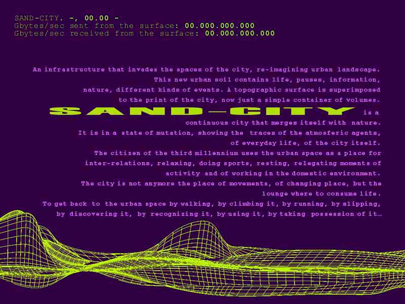 Sand-City is a continuous city that merges itself with nature. It is in a state of mutation, showing the traces of the atmospheric agents, of everyday life, of the city itself. The citizen of the third millennium uses the urban space as a place for inter-relations, relaxing, doing sports, resting, relegating moments of activity and of working in the domestic environment.
